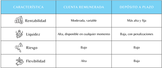 Si necesitas liquidez y control sobre tu dinero, la cuenta remunerada es ideal. Si buscas mayor rentabilidad y puedes mantener el dinero inmovilizado, el depósito a plazo es más adecuado.